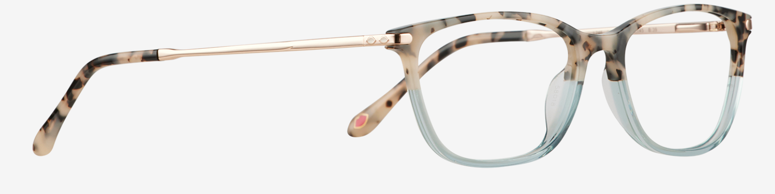 This Lulu Guinness 246 could have been directly hewn from the coastline. Its two-tone rim blends beige tort with pale translucent blue, mirroring rocky coves meeting calm, sparkling sea. Sleek gold temples add a glamorous edge before tapering into matching tort plastic.