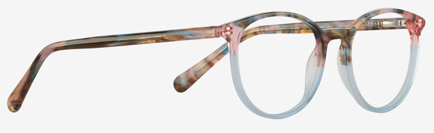Radley’s 6043 captures all the colours of seashells scattered along the shore. A swirl of multicoloured tort meets a sweep of pale blue at the base of its round rim, giving a serene, beach-washed feel. Made from semi-translucent plastic, let this design add a splash of brightness and fun to your look.